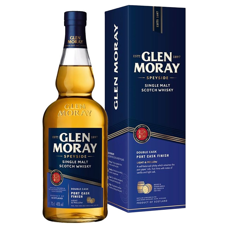 La cuvée Glen Moray Port Cask Finish est un single malt écossais de la région du Speyside, titré à 40 % vol., vieilli principalement en ex-fûts de bourbon puis terminé (“finish”) dans des fûts de vin de Porto.