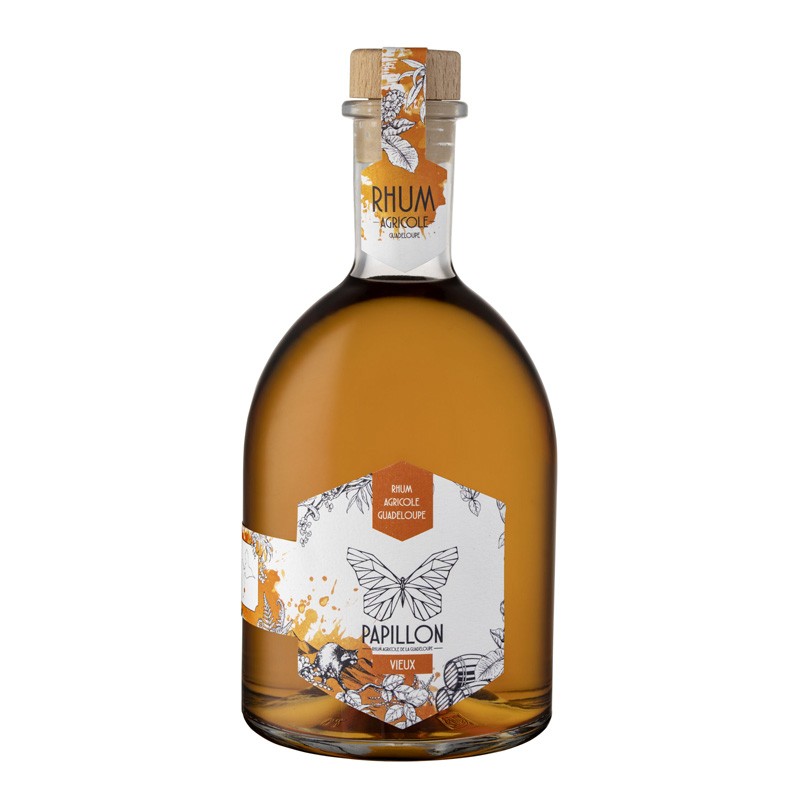 Le Rhum Vieux Papillon est un rhum agricole guadeloupéen élaboré par la famille Longueteau. Vieilli 3 ans en fûts de chêne américain neuf et ex-Bourbon, ce rhum à 45° offre un profil équilibré mêlant vanille gourmande, notes réglissées et une pointe saline délicate.
